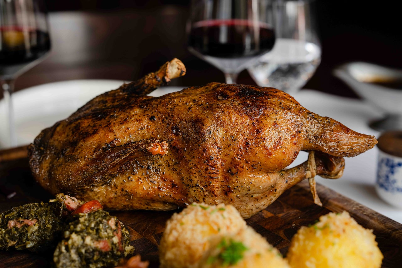 Genießen Sie zur Vorspeise eine Wirsing-Süßkartoffel-Cremesuppe, gefolgt von einer knusprigen Gänseleber mit Apfel-Kartoffelcreme. Beim Hauptgang haben Sie die "Qual der Wahl" zwischen Wildschweinbraten, Winter-Lachs, Zweierlei von der Barbarie Ente oder als vegetarische Option Boeuf von Waldpilzen. Das festliche Menü wird abgerundet von Cerise au Vin Rouge.