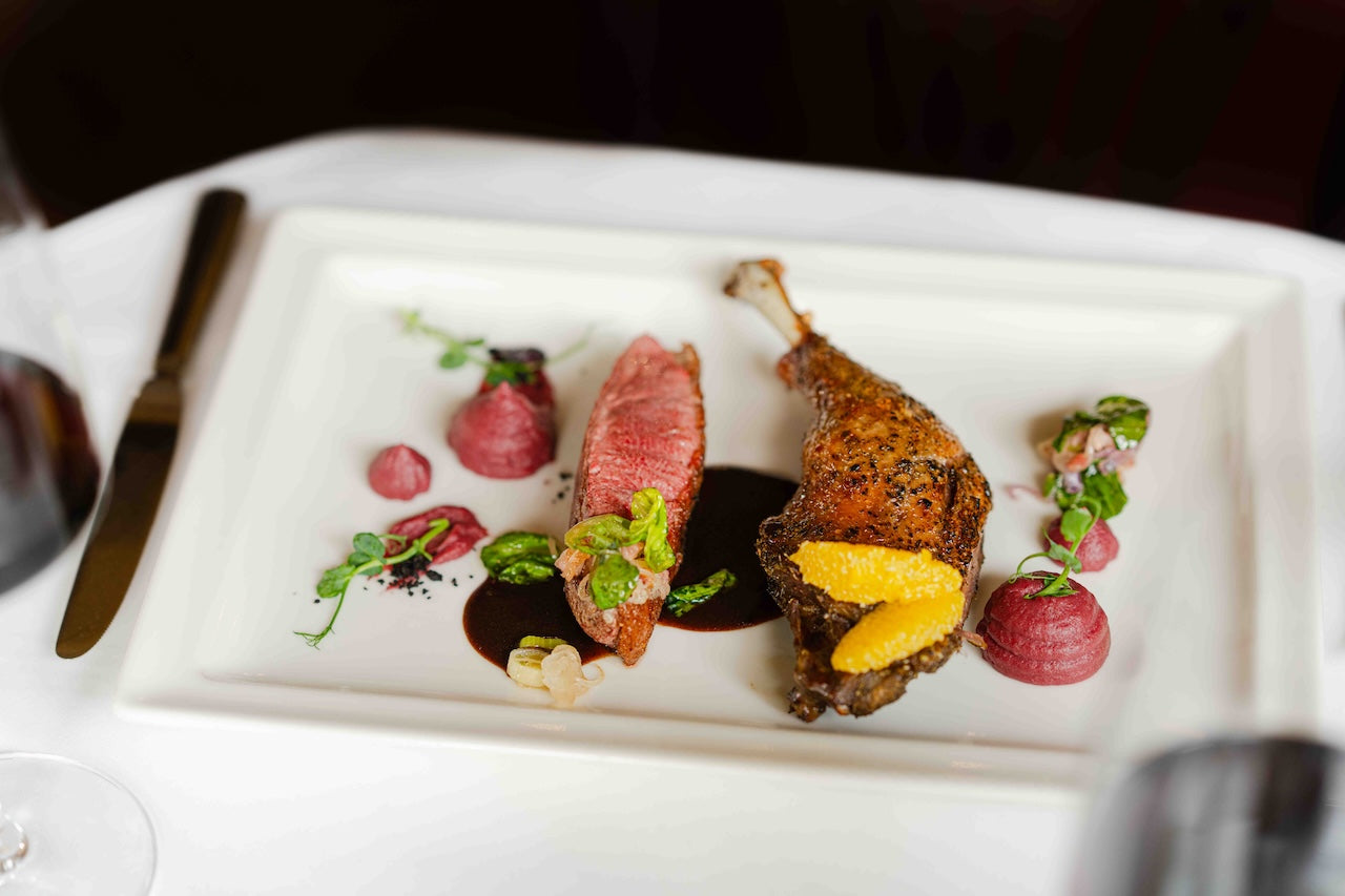 In jeder Gans stecken 25 Stunden Vorbereitung. Die Gans wird zunächst mit winterlichen Gewürzen mariniert und mit Äpfeln, Pflaumen, Zwiebeln und Gewürzen gefüllt. So ruht sie für 12-18 Stunden, damit die Gewürze in das Fleisch ziehen. Anschließend wird die Gans schonend auf Niedergartemperatur 7 Stunden gegart. Das bei der Zubereitung austretende, würzige Fett wird in der Sauce sowie zum Überstreichen der Gans genutzt. Für eine knusprige Haut wird die Gans zuletzt auf hoher Temparatur kross gebacken.