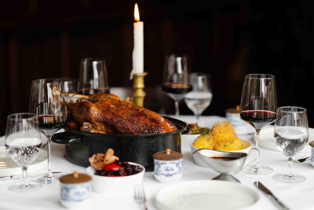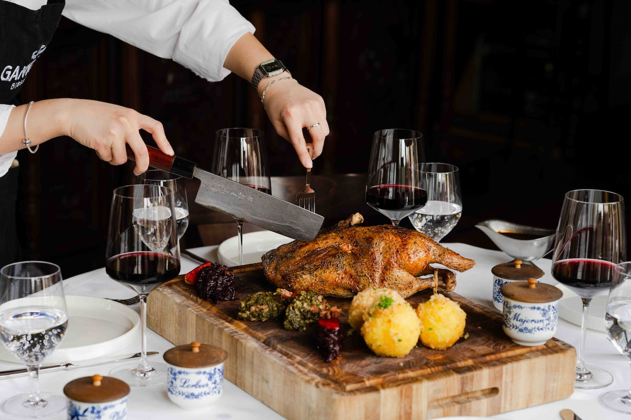 In jeder Gans stecken 25 Stunden Vorbereitung. Die Gans wird zunächst mit winterlichen Gewürzen mariniert und mit Äpfeln, Pflaumen, Zwiebeln und Gewürzen gefüllt. So ruht sie für 12-18 Stunden, damit die Gewürze in das Fleisch ziehen. Anschließend wird die Gans schonend auf Niedergartemperatur 7 Stunden gegart. Das bei der Zubereitung austretende, würzige Fett wird in der Sauce sowie zum Überstreichen der Gans genutzt. Für eine knusprige Haut wird die Gans zuletzt auf hoher Temparatur kross gebacken.