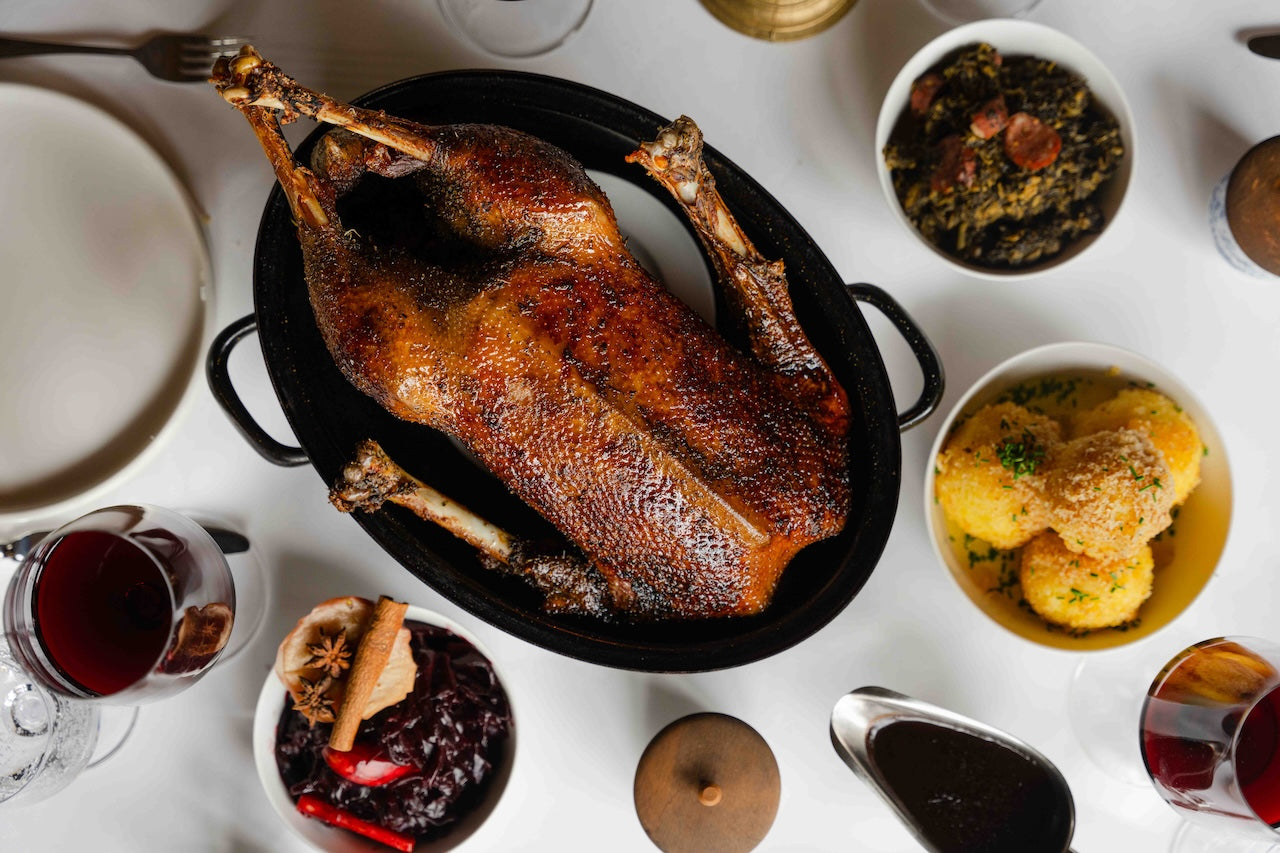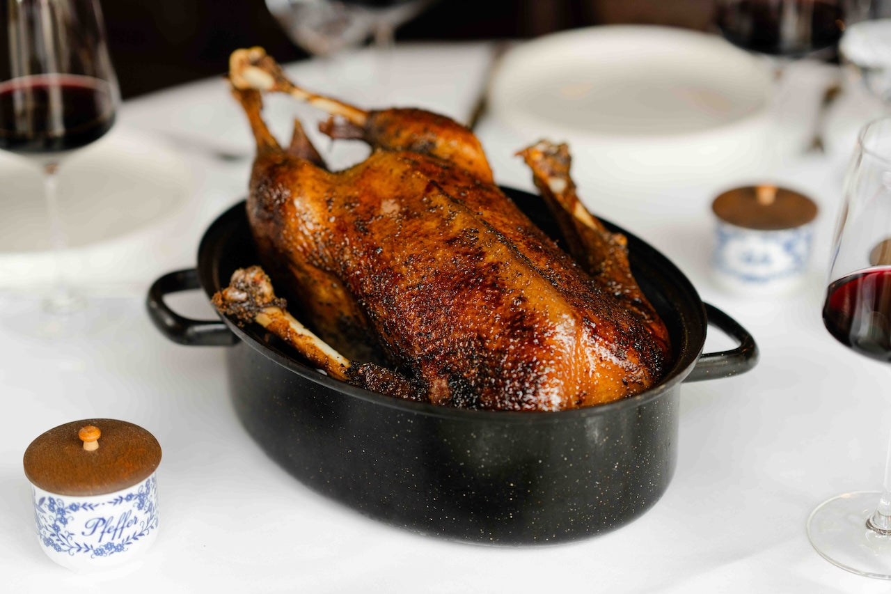 In jeder Gans stecken 25 Stunden Vorbereitung. Die Gans wird zunächst mit winterlichen Gewürzen mariniert und mit Äpfeln, Zwiebeln und Gewürzen gefüllt. So ruht sie für 12-18 Stunden, damit die Gewürze in das Fleisch ziehen. Anschließend wird die Gans schonend auf Niedergartemperatur 7 Stunden gegart. Das bei der Zubereitung austretende, würzige Fett wird in der Sauce sowie zum Überstreichen der Gans genutzt. Für eine knusprige Haut wird die Gans zuletzt auf hoher Temparatur kross gebacken.