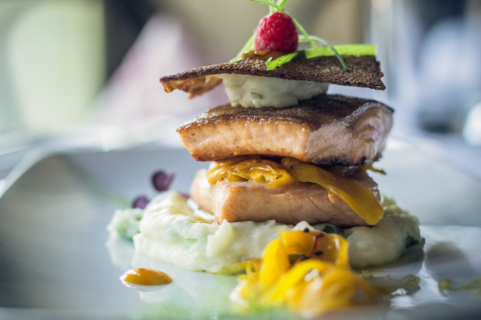 Halbgebeizter Lachs mit Spekulatiuskruste, mild geräucherten Pommes Macaire, Kräuter-Wirsing und Safrancreme.